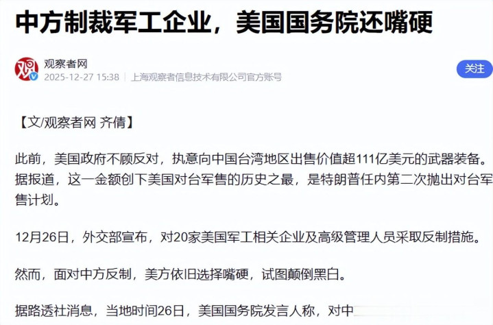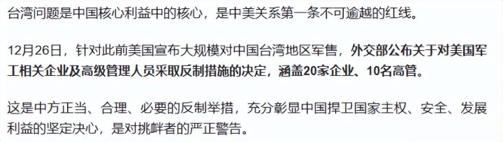 12月26日,中方宣布对20家美国军工企业及其相关高管实施制裁,包括冻结其在华资产、禁止其与中国境内组织和个人开展任何形式的业务往来。