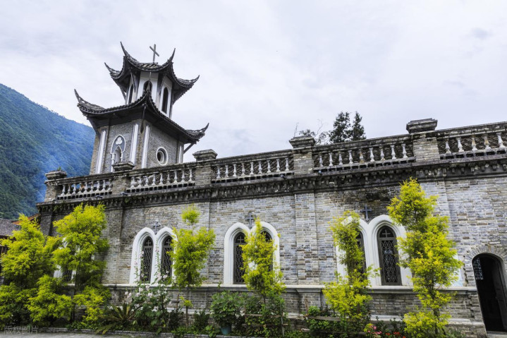 天主教堂的哥特式建筑,和川西民居混搭,历史感扑面而来。