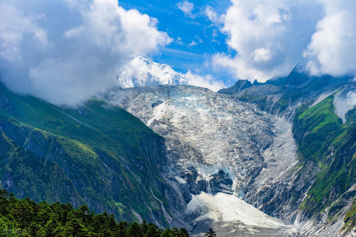 海螺沟冰川与古镇相邻,天气好的时候过来,贡嘎神山就在你的面前。冰川在阳光下闪着蓝光,冰舌延伸至森林,与翠绿的树木形成鲜明对比。海螺沟的温泉是绝佳的放松之地。泡温泉看雪山,体验感绝了。