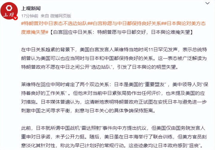 可是从最新白宫的回应我们可以看出,美方谁都不想得罪,也就是美方没有说站在日本一方,也没有说站在我们这一方,只是回应他们既想和我们保持很好的关系,也要和日方保持非常好的关系,这个回应出来后,日方也是非常迷惑,毕竟到底美国帮助不帮助他们也没有了地气,所以日本舆论难掩失望。